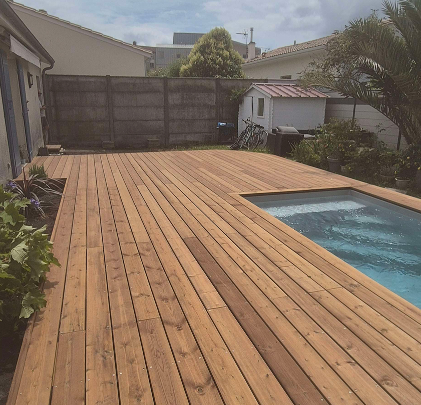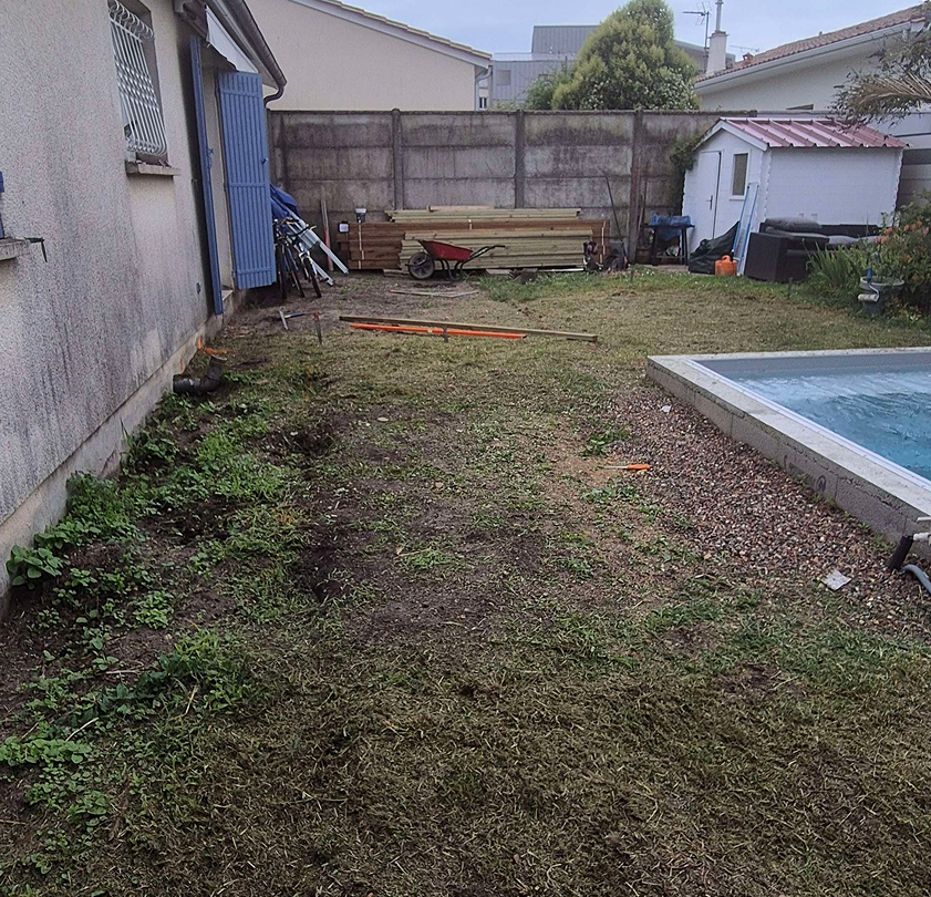 À Bègles, notre cliente venait tout juste de faire construire sa piscine enterrée. Elle rêvait désormais d’un véritable espace de vie extérieur : un coin terrasse pour se détendre, bronzer sur des bains de soleil, et profiter pleinement de sa piscine durant les beaux jours.